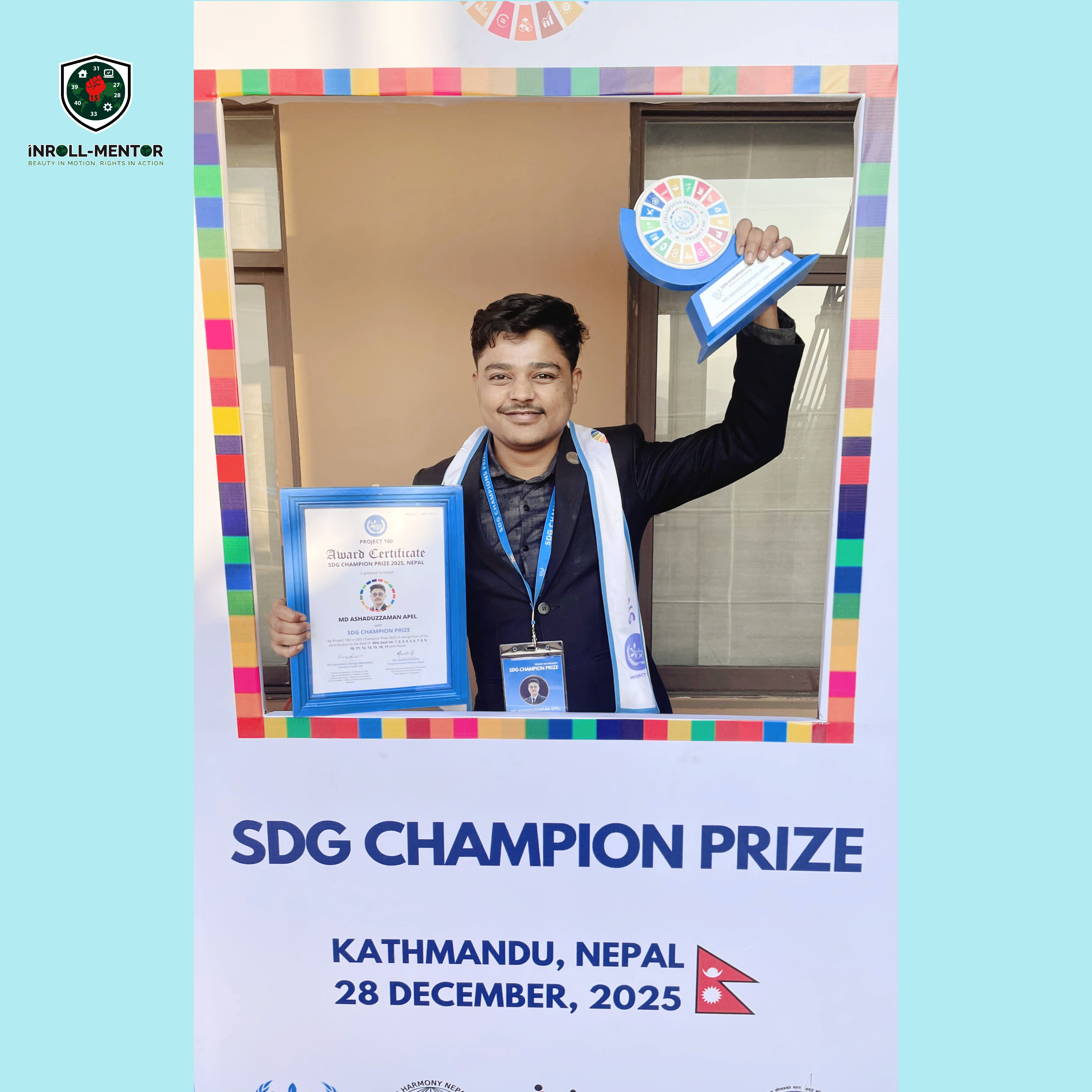 In a landmark moment for global innovation and youth leadership, Md. Ashaduzzaman Apel (21), a visionary social entrepreneur and Founder & CEO of INROLL-MENTOR PUBLIC LIMITED (project-based entity under establishment), has been conferred with the prestigious fully funded SDG Champion Prize in Kathmandu, Nepal.