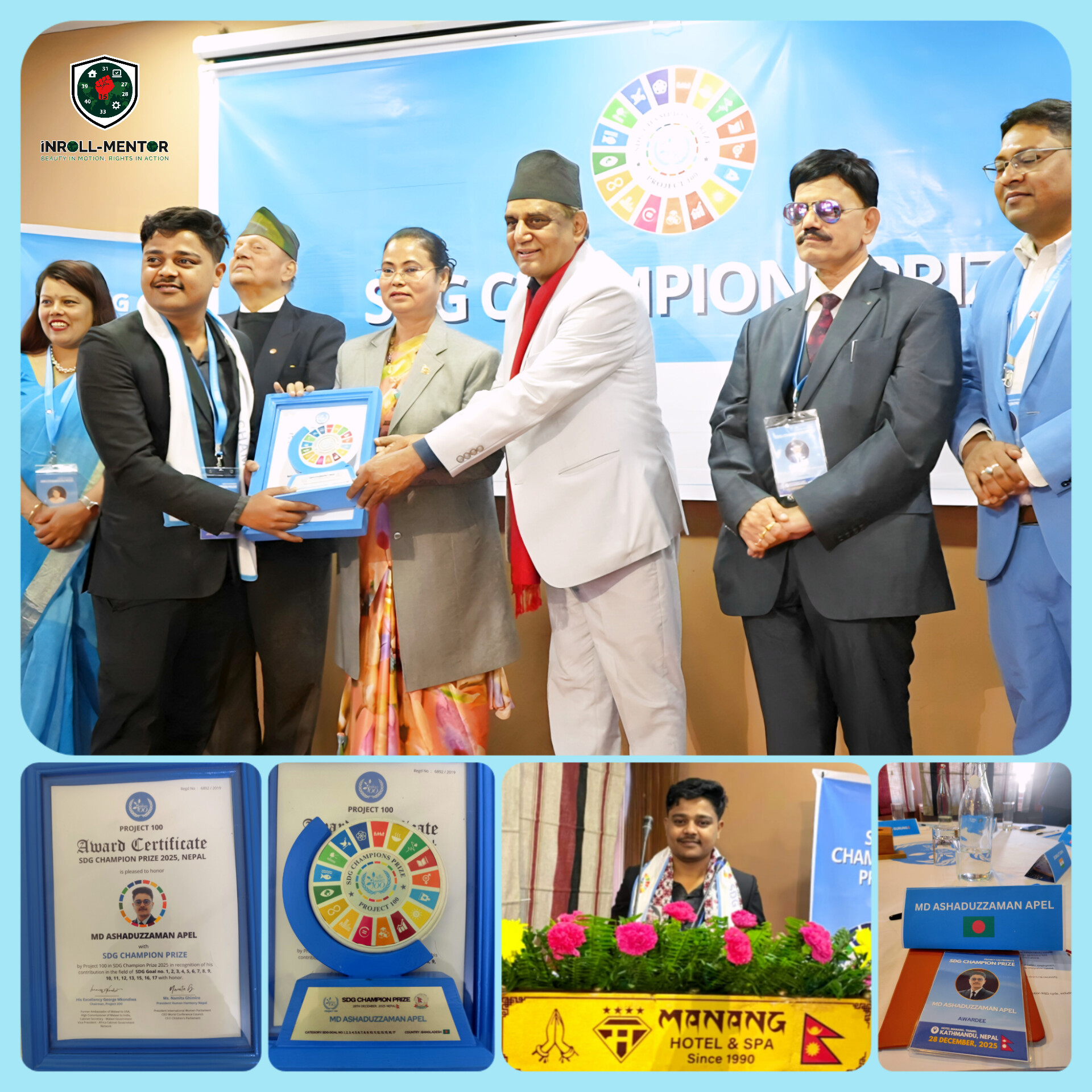 In a landmark moment for global innovation and youth leadership, Md. Ashaduzzaman Apel (21), a visionary social entrepreneur and Founder & CEO of INROLL-MENTOR PUBLIC LIMITED (project-based entity under establishment), has been conferred with the prestigious fully funded SDG Champion Prize in Kathmandu, Nepal.